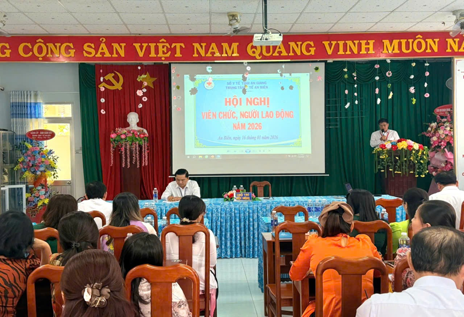 Chiều ngày 16/01/2026, Công đoàn cơ sở Trung tâm Y tế An Biên phối hợp tổ chức Hội nghị viên chức, người lao động năm 2026; dự và chủ trì Hội nghị có đồng chí Huỳnh Đức Hòa, Bí thư Đảng ủy, Giám đốc Trung tâm và đồng chí Quách Minh Tấn, Chủ tịch Công đoàn cơ sở, cùng 50 đại biểu đại diện cho 265 viên chức, người lao động tham dự.