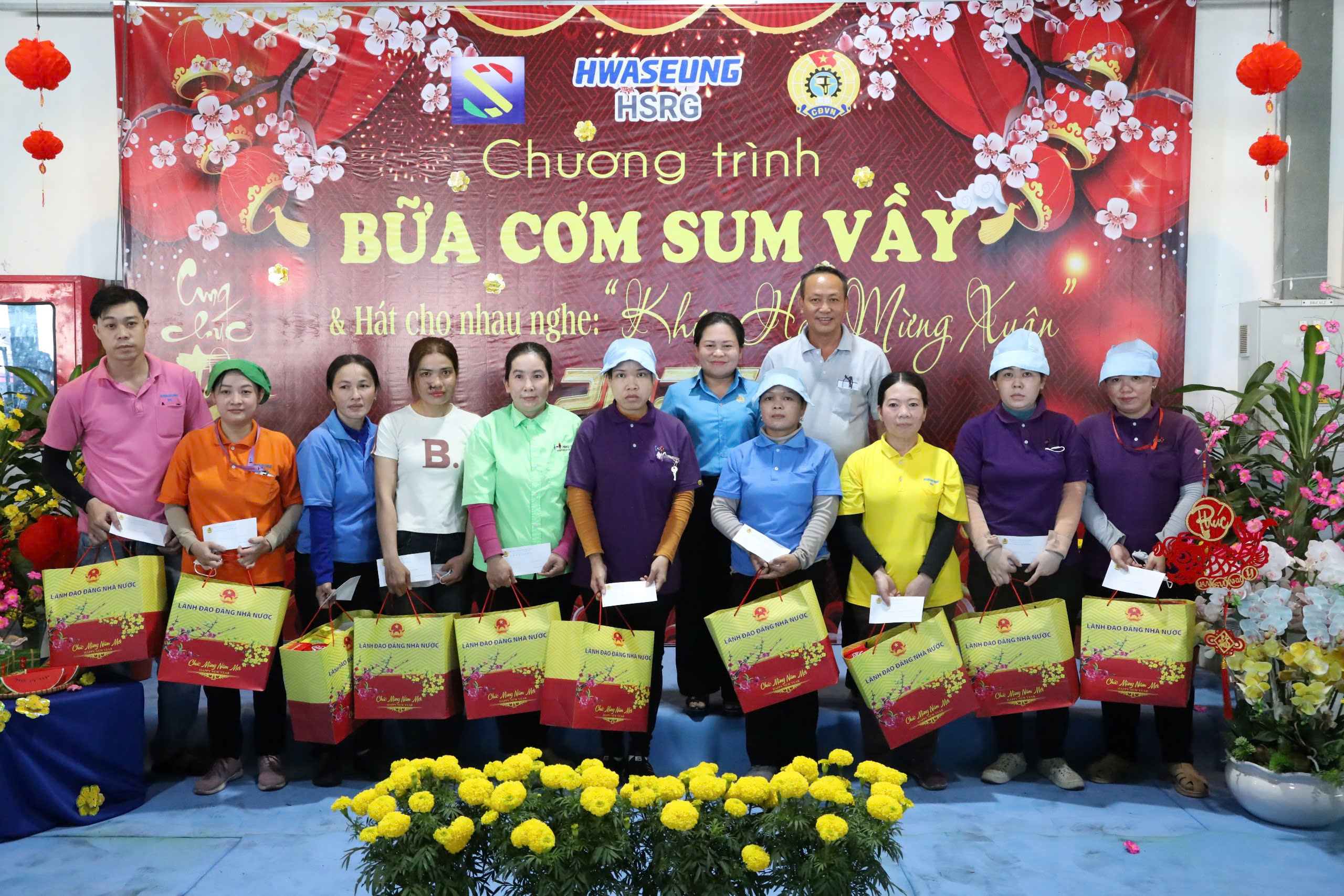 Chủ tịch Liên đoàn Lao động tỉnh Kiên Giang Trương Thanh Thúy (hàng sau, bên trái) tặng quà cho đoàn viên, người lao động Công đoàn cơ sở Công ty Trách nhiệm hữu hạn Hwaseung Rạch Giá, trực thuộc Liên đoàn Lao động tỉnh dịp Tết Nguyên đán Ất Tỵ 2025.