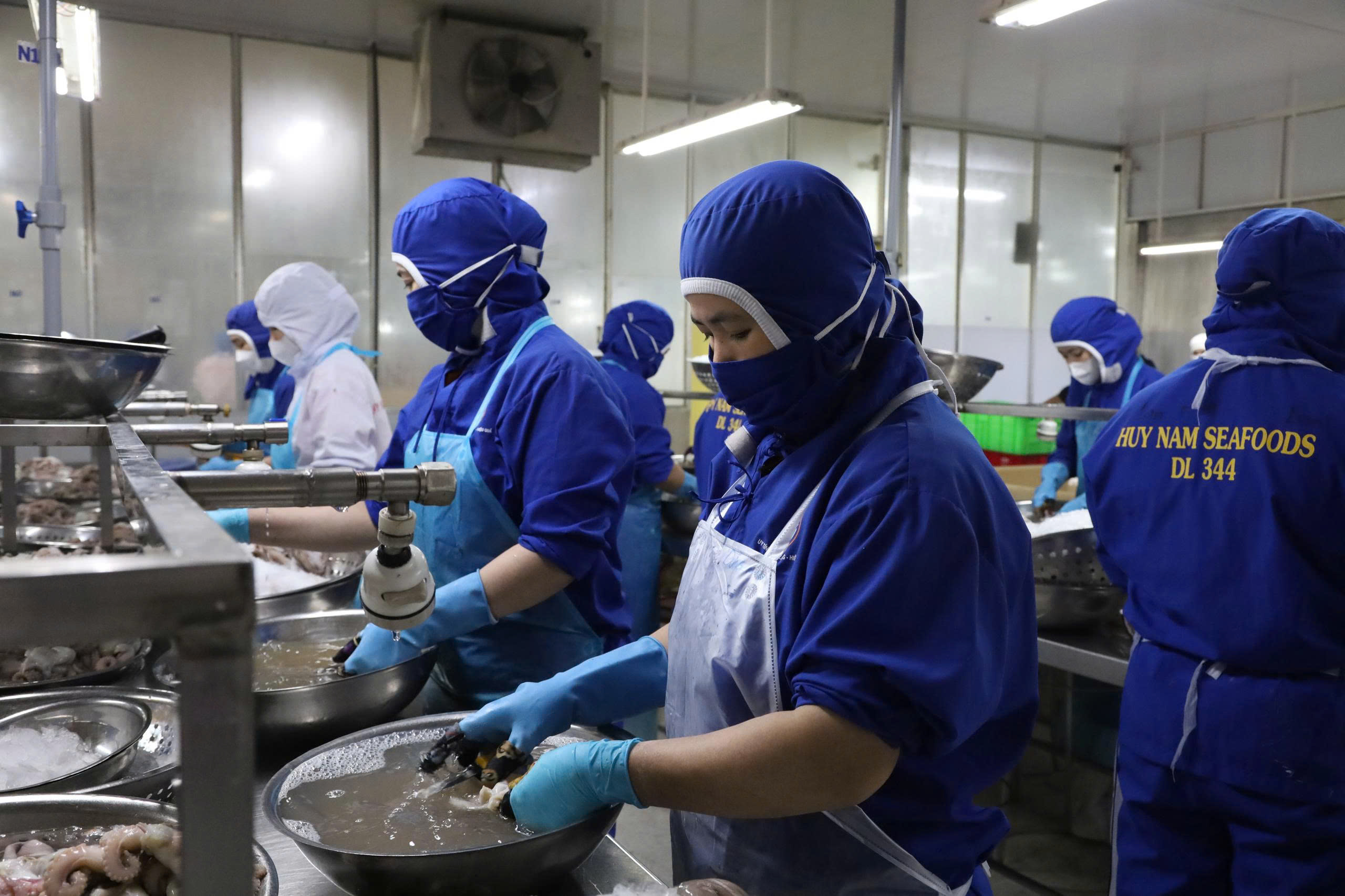 Người lao động Công ty Trách nhiệm hữu hạn Huy Nam, xã Bình An chế biến mực xuất khẩu