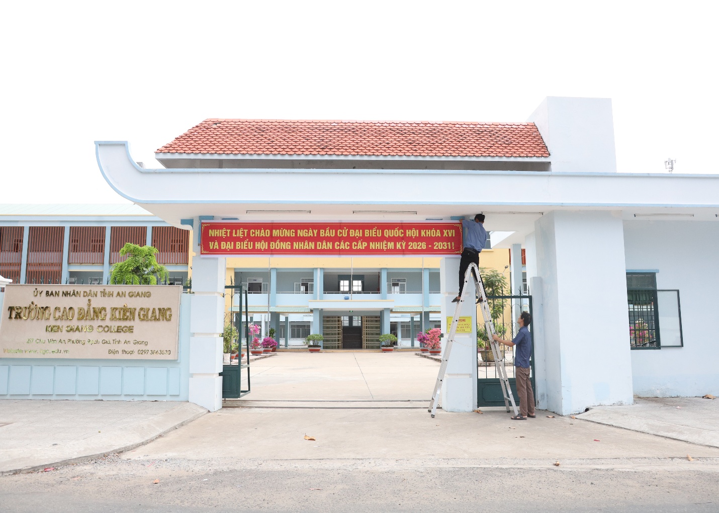 Đoàn viên, người lao động Công đoàn cơ sở Trường Cao đẳng Kiên Giang treo băng rôn chào mừng Cuộc bầu cử đại biểu Quốc hội Khóa XVI và đại biểu Hội đồng nhân dân các cấp, nhiệm kỳ 2026-2031. Ảnh: BÍCH TUYỀN