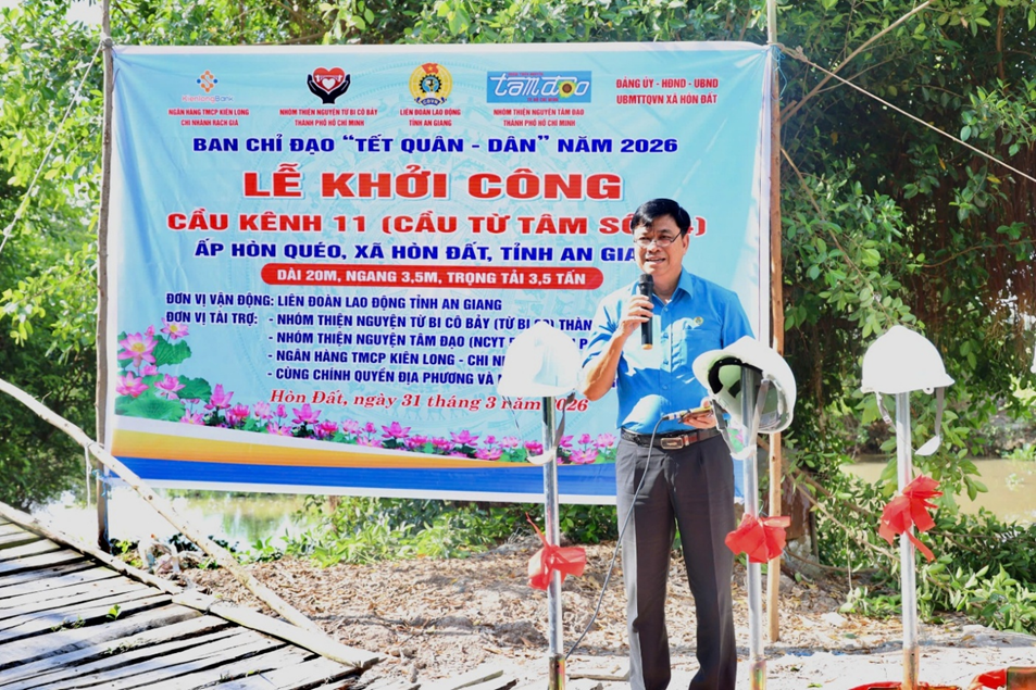 Ngày 31/3, Liên đoàn Lao động tỉnh An Giang phối hợp UBND xã Hòn Đất và các đơn vị tài trợ tổ chức lễ khởi công xây dựng cầu Kênh 11 tại ấp Hòn Quéo, góp phần cải thiện điều kiện đi lại, thúc đẩy phát triển kinh tế - xã hội tại địa phương.
