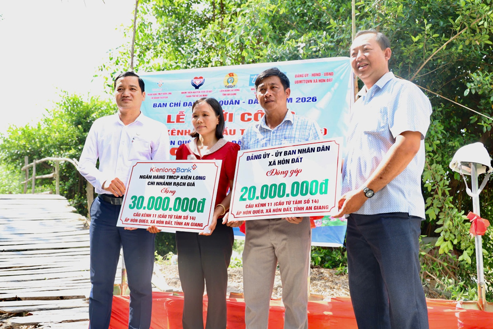 Đại diện Ngân hàng TMCP Kiên Long - Chi nhánh Hòn Đất và đại diện Đảng uỷ - UBND xã Hòn Đất trao bảng tượng trưng hỗ trợ xây dựng cầu cho đại diện ấp Hòn Quéo và ấp Lình Huỳnh