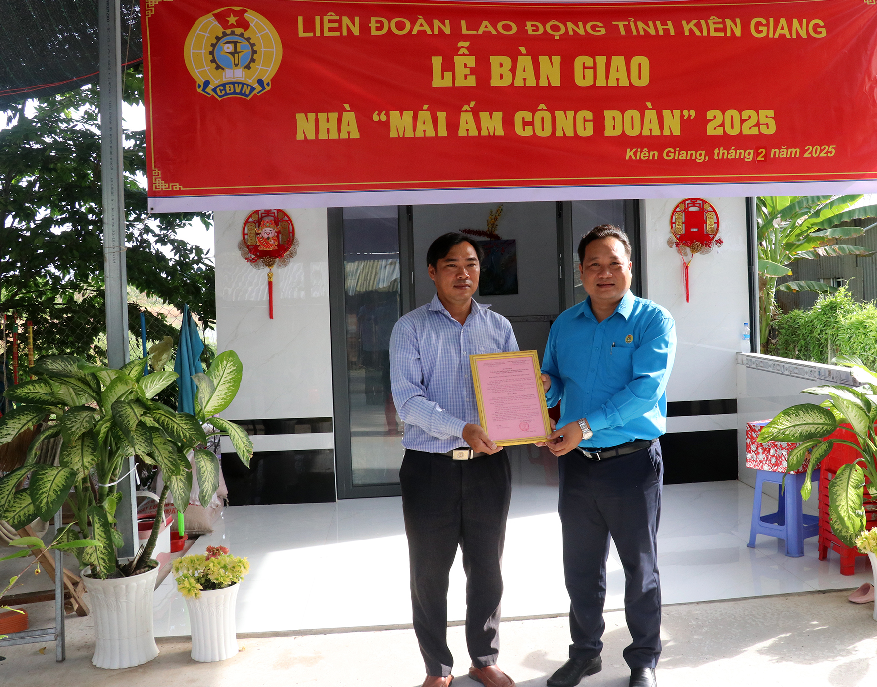 Đ/c Phạm Văn Đằng (phải), Phó Chủ tịch Thường trực LĐLĐ tỉnh Kiên Giang trao quyết định bàn giao “Mái ấm Công đoàn” cho đoàn viên Phan Trung Kiên.