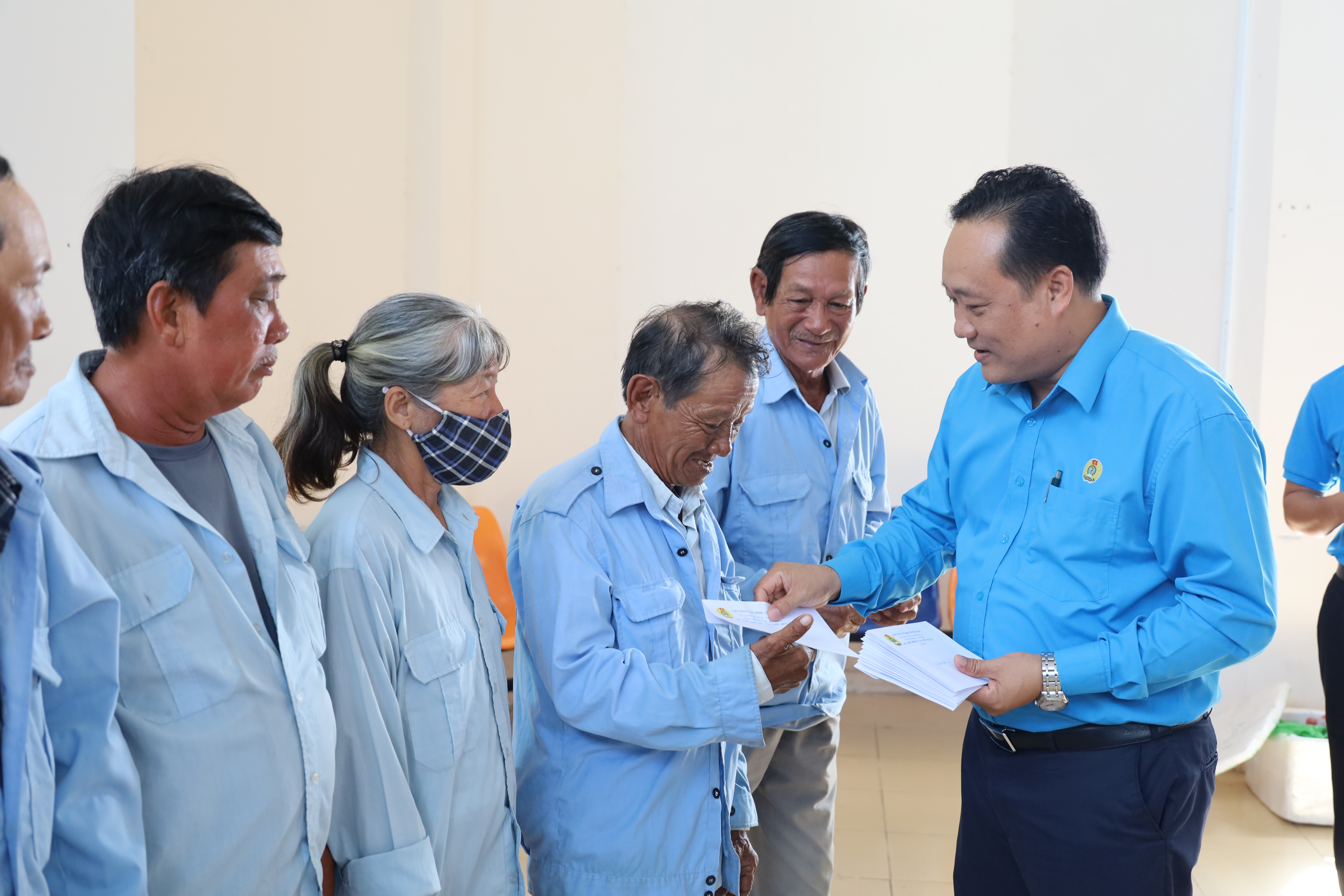 Cũng trong đợt này, đoàn đã đến thăm và tặng quà Tết cho 30 đoàn viên, người lao động của Công đoàn cơ sở thành viên Công ty CP Phát triển Đô thị Kiên Giang thuộc Công đoàn cơ sở Công ty CP Tập đoàn Tư vấn Đầu tư Xây dựng Kiên Giang đang làm việc vệ sinh, thu gom rác của tuyến đường Tôn Đức Thắng, với mỗi suất trị giá 500 ngàn đồng.