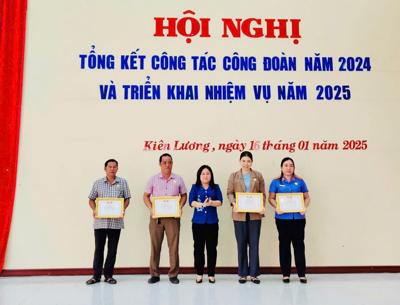 Đ/c Huỳnh Thanh Nhã, Phó Chủ tịch UBND huyện (thứ tám từ trái sang) và Đ/c Lê Thanh Tòng, Chủ tịch LĐLĐ huyện (thứ bảy từ trái sang) trao giấy khen của UBND huyện cho các cá nhân có thành tích xuất sắc trong hoạt động công đoàn năm 2024