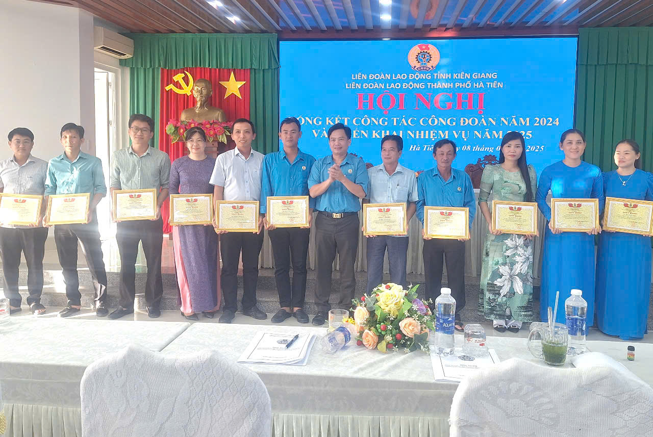 Đ/c Nguyễn Việt Hà, Thành ủy viên - Chủ tịch LĐLĐ Tp. Hà Tiên (thứ 6 từ phải qua) trao Giấy khen cho các cá nhân có thành tích xuất sắc trong phong trào thi đua lao động giỏi và xây dựng tổ chức Công đoàn vững mạnh năm 2024.