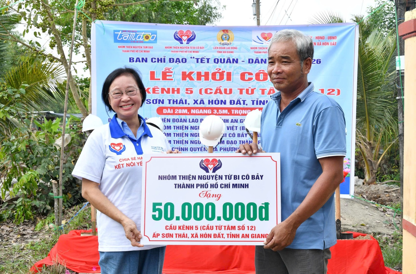 Đại diện Nhóm thiện nguyện Từ Bi Cô Bảy TP. Hồ Chí Minh (bên trái) tài trợ kinh phí xây cầu Kênh 5, ấp Sơn Thái.