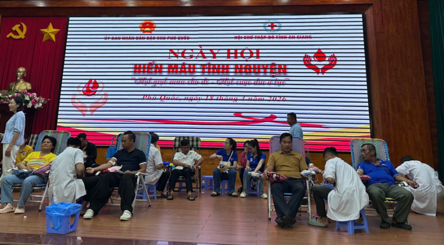 Sáng ngày 18/4/2026, tại đặc khu Phú Quốc, Ủy ban nhân dân đặc khu Phú Quốc phối hợp với Hội Chữ thập đỏ tỉnh tổ chức Ngày hội hiến máu tình nguyện đợt 1 năm 2026. Chương trình thu hút đông đảo cán bộ, đoàn viên, người lao động tham gia, tạo không khí sôi nổi, lan tỏa tinh thần sẻ chia vì cộng đồng.
