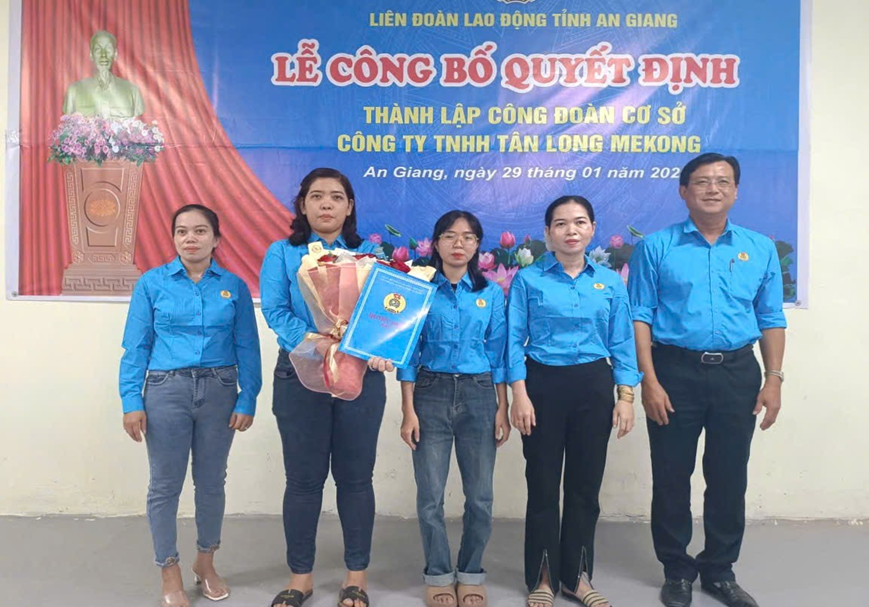 Sáng ngày 29.01 tại xã Chợ Vàm, Liên đoàn Lao động tỉnh An Giang phối hợp với Công ty TNHH Tân Long MeKong tổ chức lễ công bố Quyết định kết nạp đoàn viên, thành lập Công đoàn cơ sở Công ty TNHH Tân Long MeKong. Dự buổi lễ có đồng chí Nguyễn Nhật Tiến, Phó Chủ tịch Liên đoàn Lao động tỉnh, Trưởng ban công tác công đoàn cơ quan Ủy ban MTTQ Việt Nam tỉnh; đồng chí Đỗ Thị Cẩm Nhi, Phó Chủ tịch Thường trực UBMTTQ Việt Nam xã Chợ Vàm; bà Phạm Như Ý, Trưởng phòng nhân sự Cty.