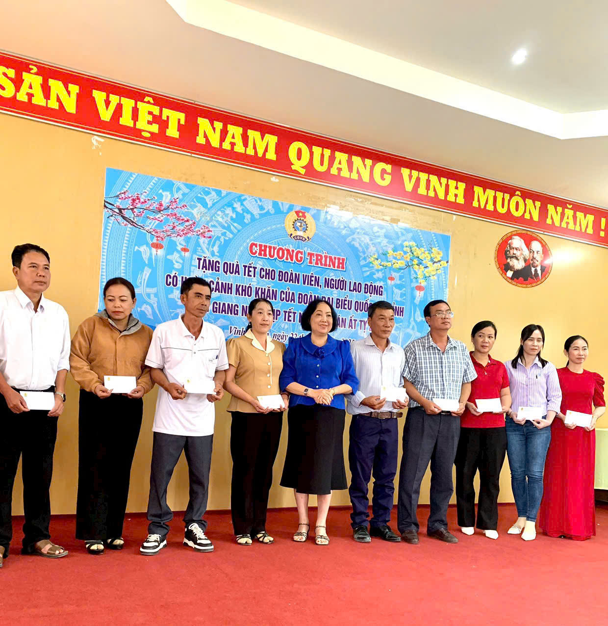 Đồng chí Trang Thị Bích Ngọc (thứ 5 từ trái sang) - Phó Chủ tịch LĐLĐ tỉnh tặng quà cho đoàn viên, người lao động khó khăn